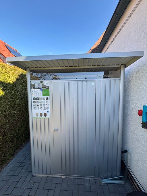 Gerätehaus aus Metall auch mit Fundament erhältlich